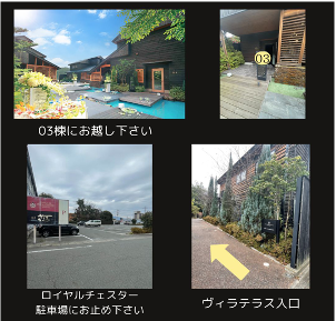 ※駐車場をロイヤルチェスター専用🅿をご利用下さい。満車の際は、道反対の砂利の駐車場にお止め下さい。ヴィラテラスは3棟の建物がたっております。看板【03】へお越しください。